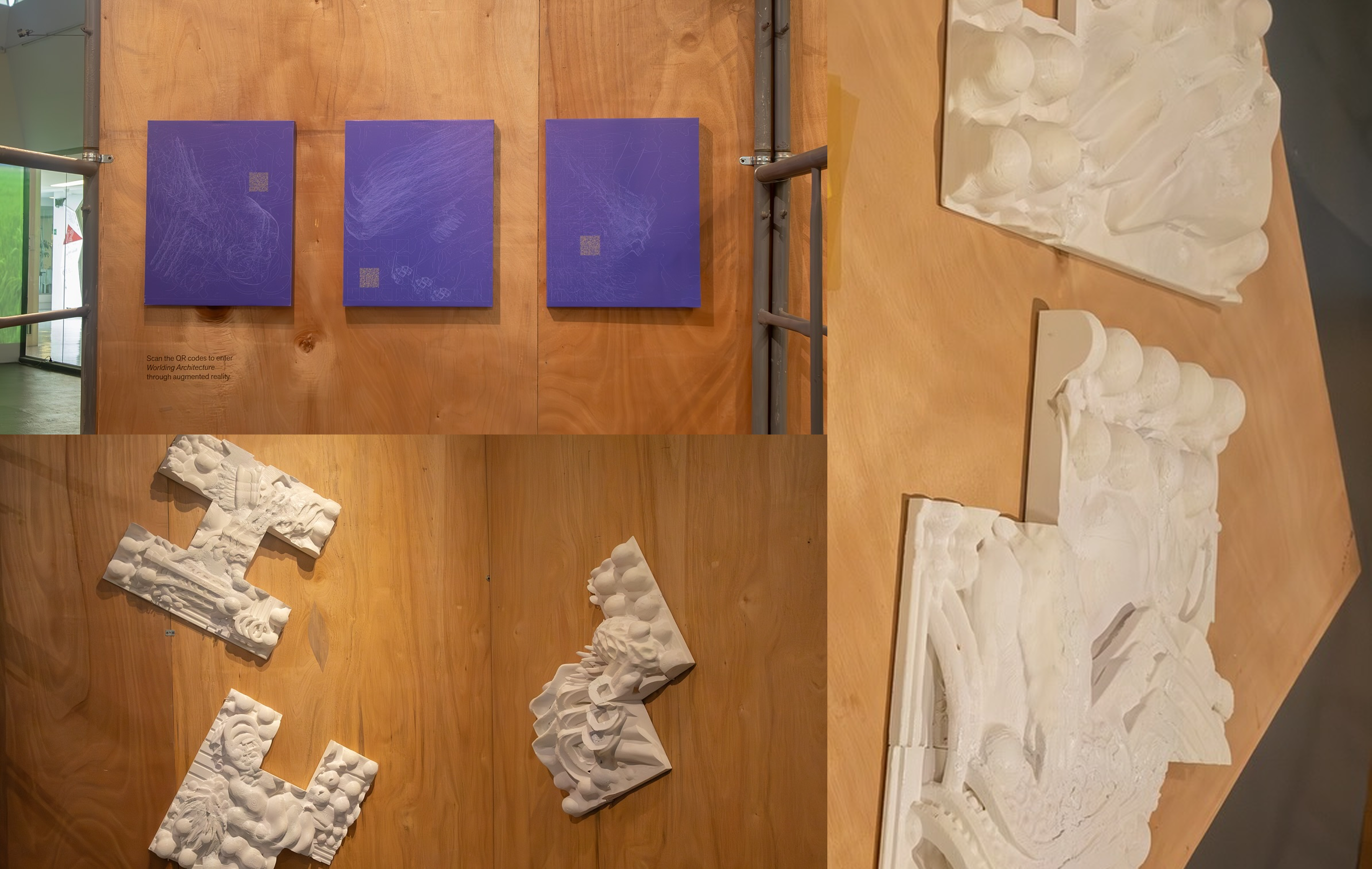 Medium: 3 canvas printed artworks (Fuzzy Forms) + 6 3D printed bas reliefs (Hyper Prouns) + installation arrangement